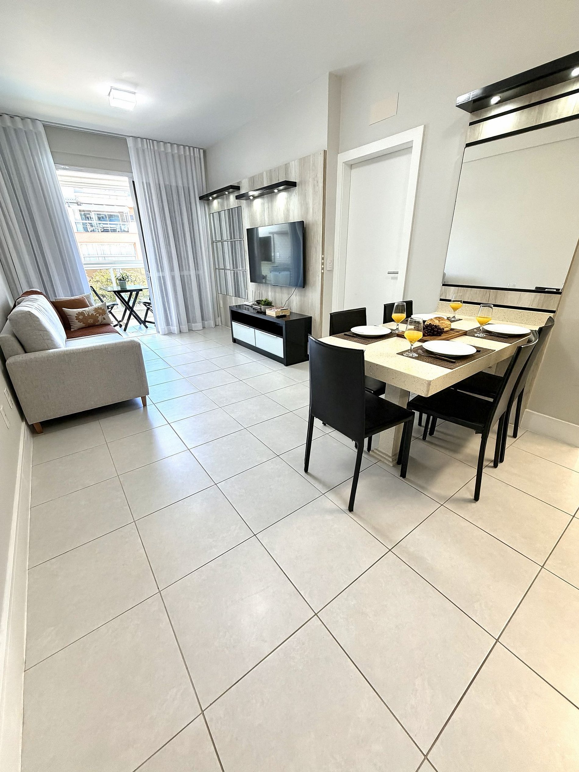 - Já a sala possui um sofá amplo e confortável, smart TV, integração com a cozinha e varanda.
