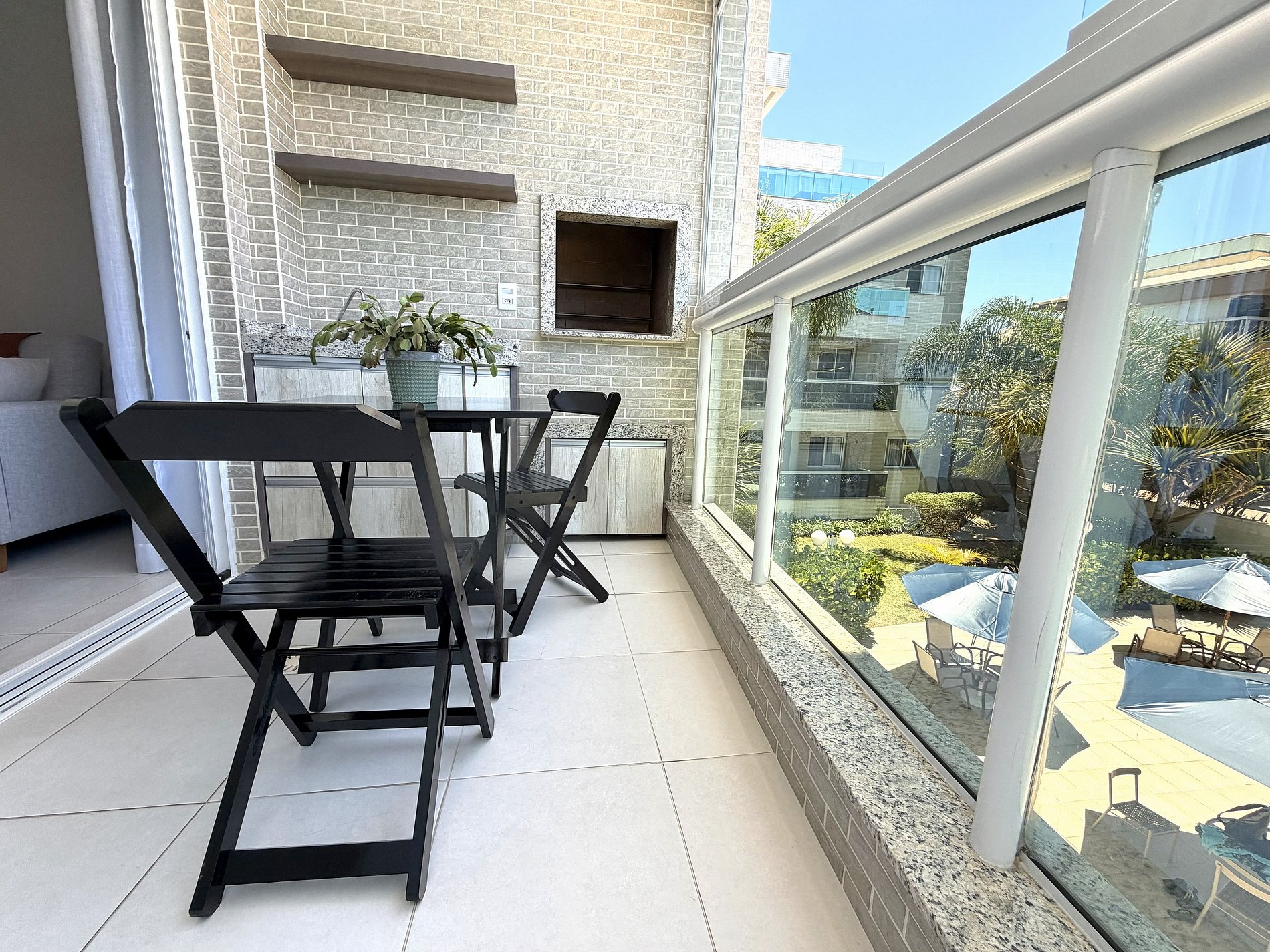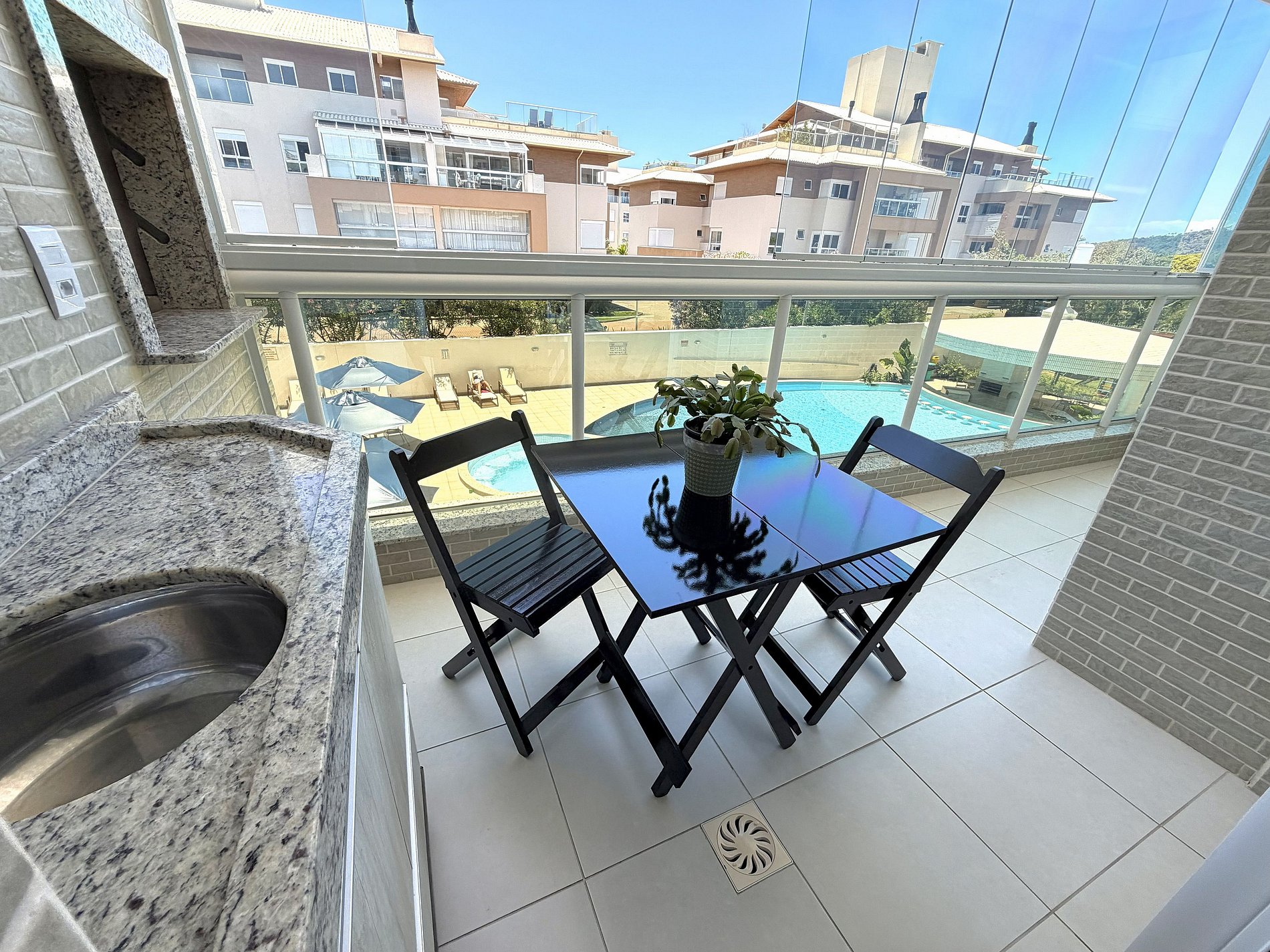 - A sacada do apartamento tem churrasqueira, mesa e vista para a piscina + natureza.