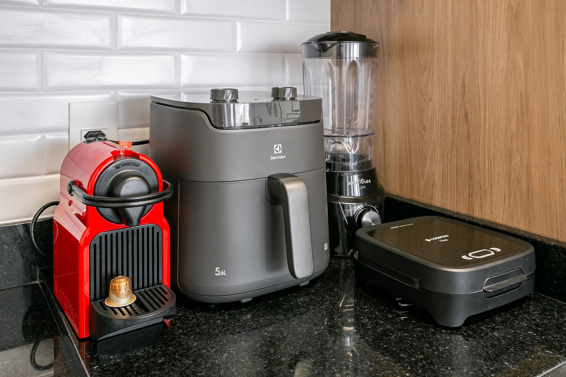 A cozinha é muito bem equipada, com todos os utensílios novíssimos: micro-ondas, forno moderno, fogão, geladeira, airfry, cafeteira, liquidificador e tudo mais que você precisa para o preparo das suas refeições.