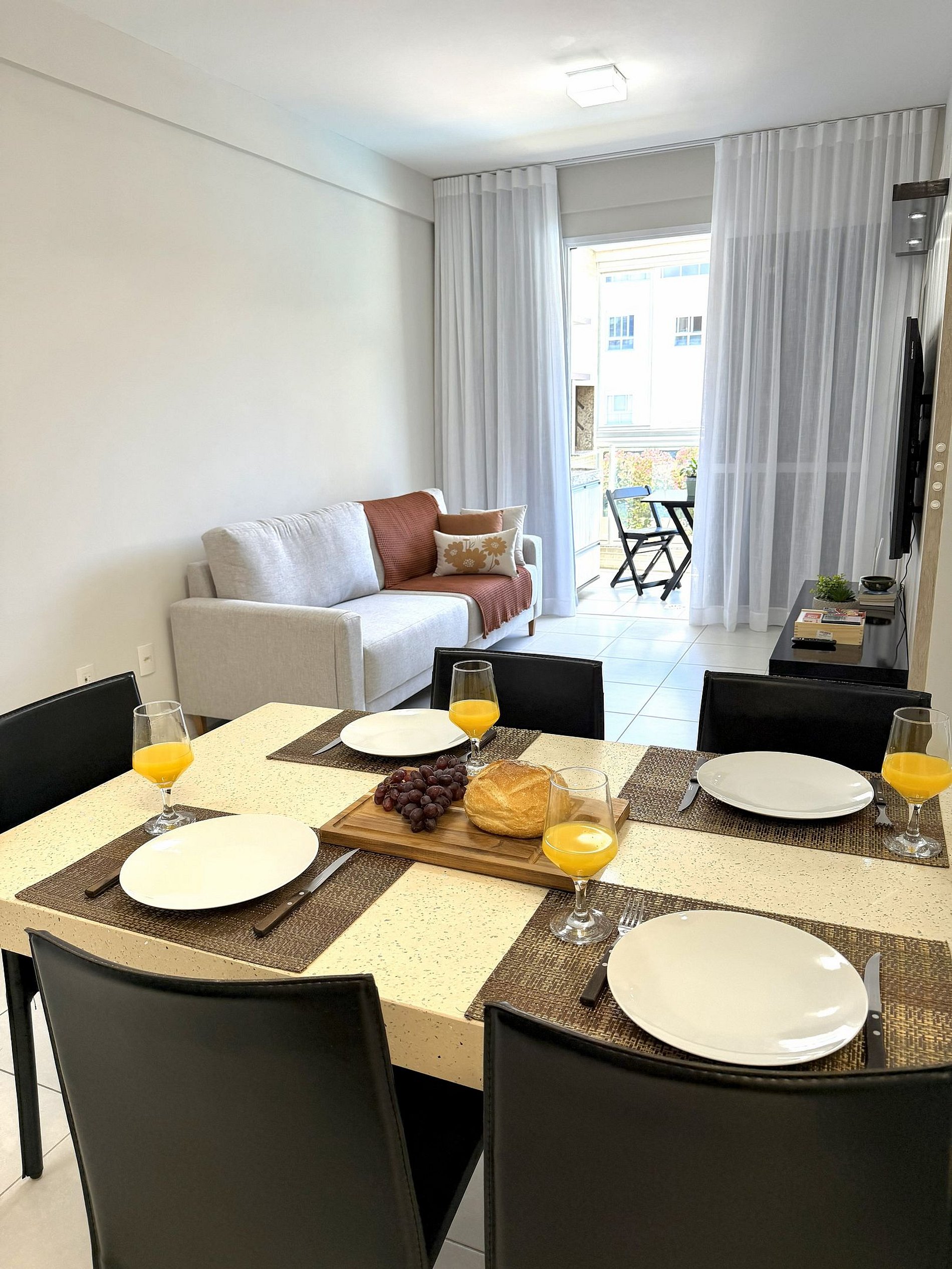 Comfortable apartment with a private barbecue on the balcony, located in a beachfront condominium with an amazing pool. The kitchen is modern and fully equipped. The balcony features a barbecue grill, table, and offers views of the pool and lush nature. There are two bedrooms, one of which is a suite, and both have air conditioning. The bed linens are simply impeccable. The living room has a spacious and comfortable sofa, smart TV, and is integrated with the kitchen and balcony.