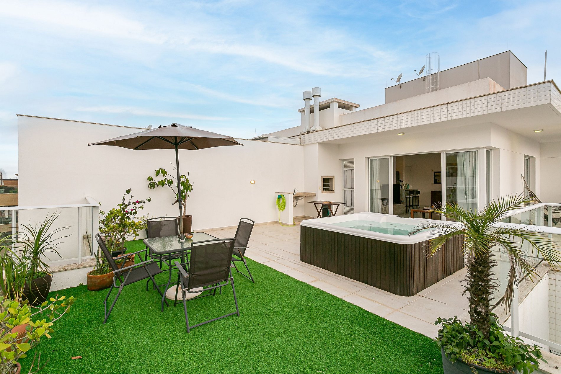 - Terraço privativo com churrasqueira, jacuzzi e área externa de refeições.