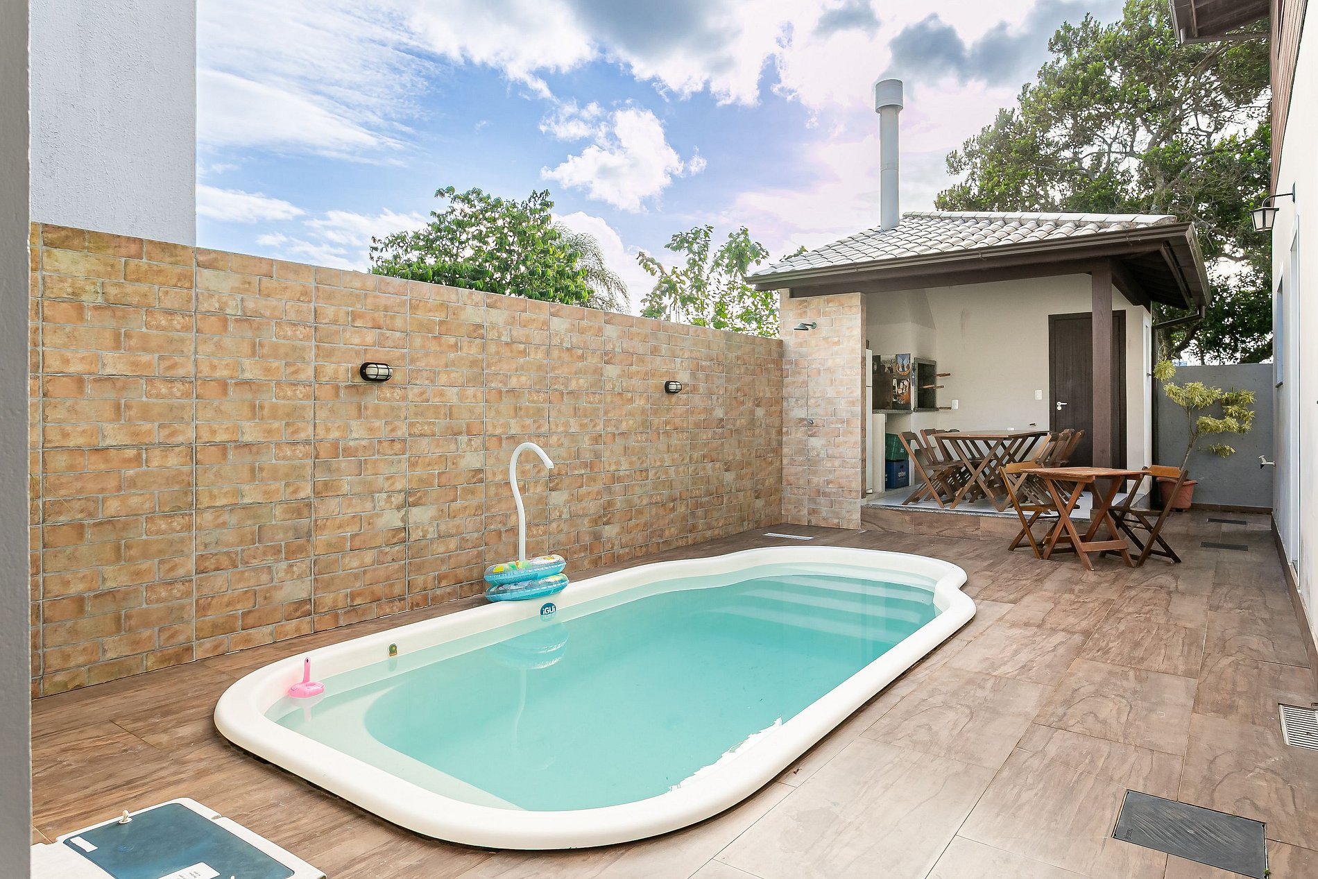 Área externa incrível com churrasqueira integrada à piscina.