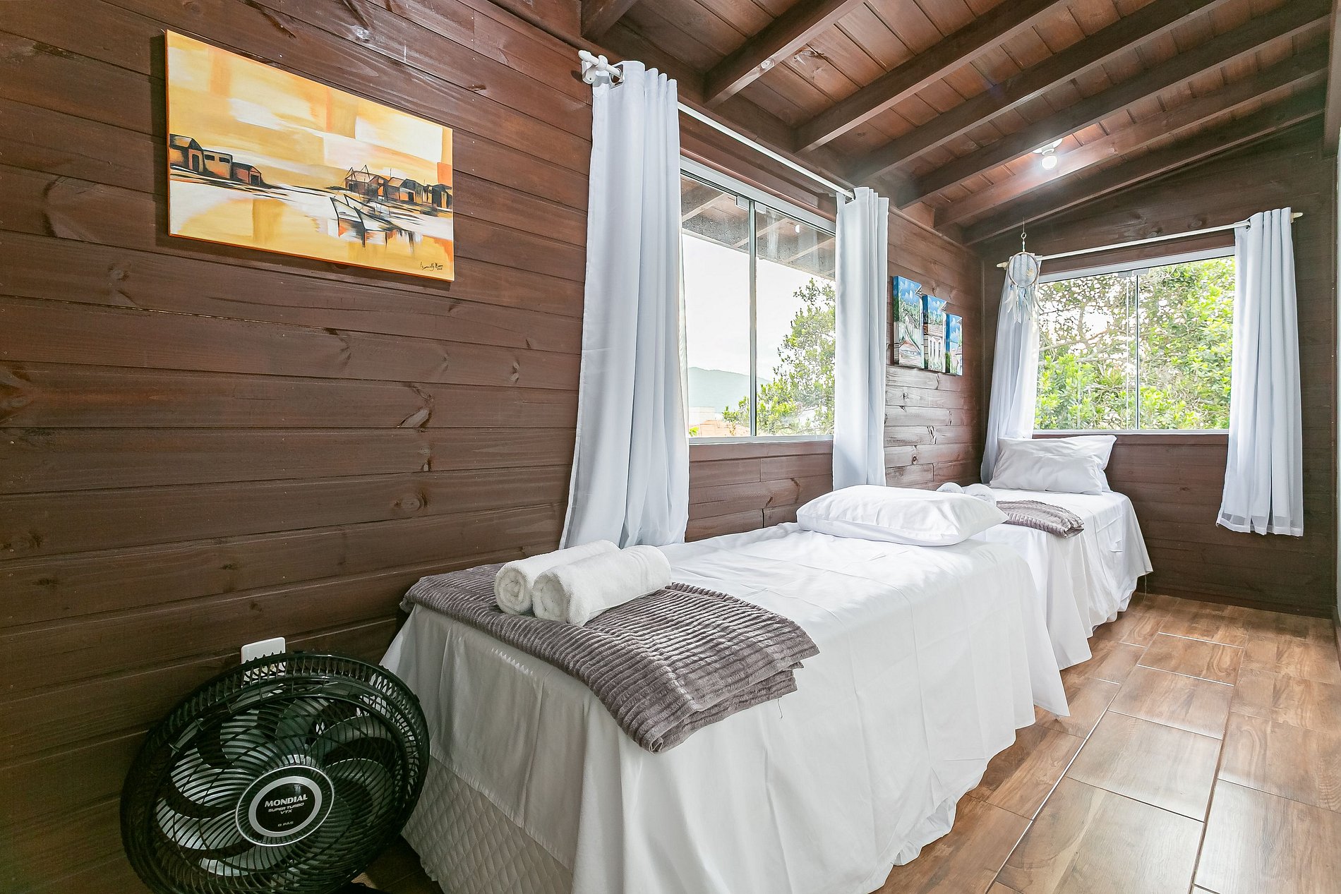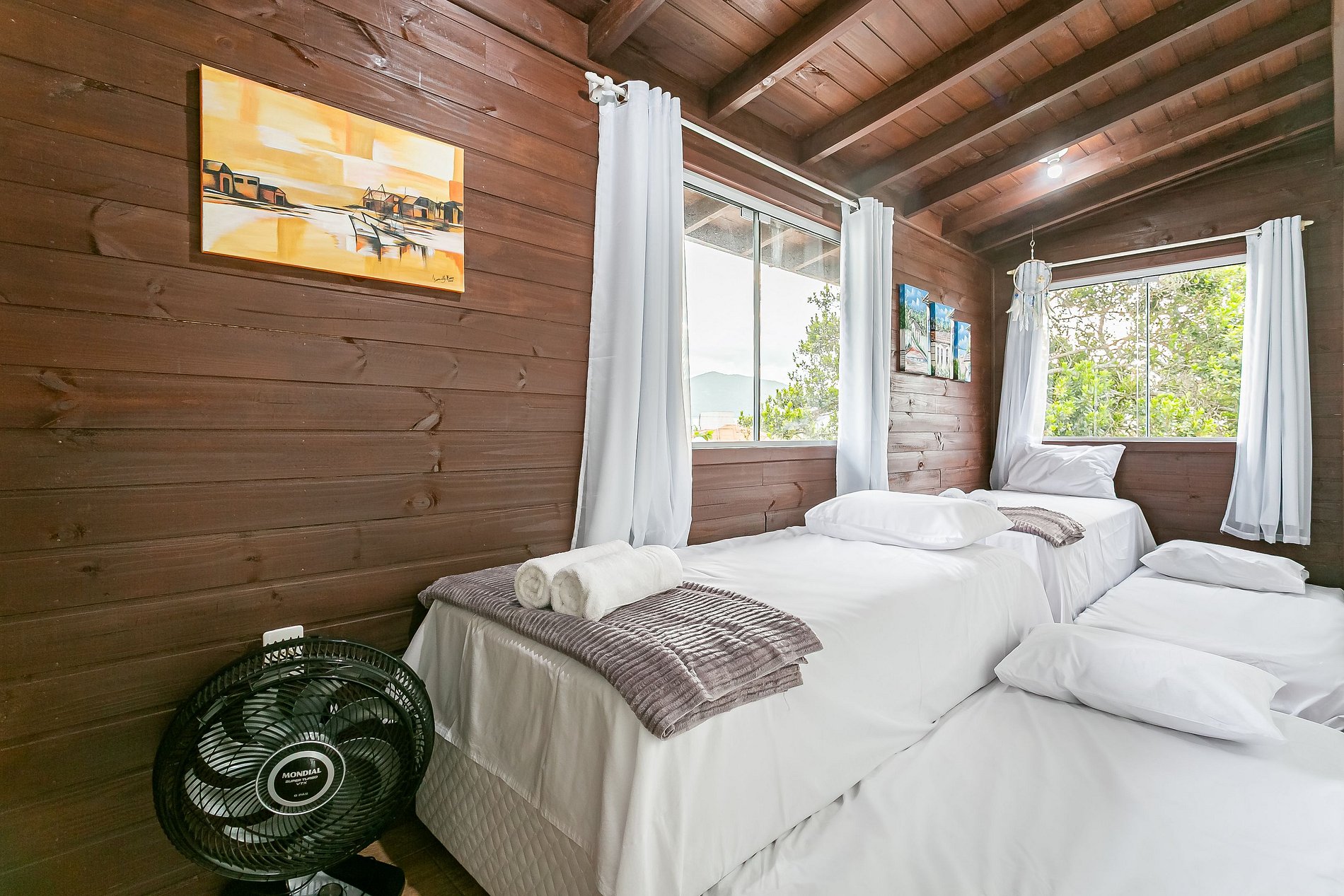 Ar condicionado em 4 quartos e ventilador no quinto quarto.